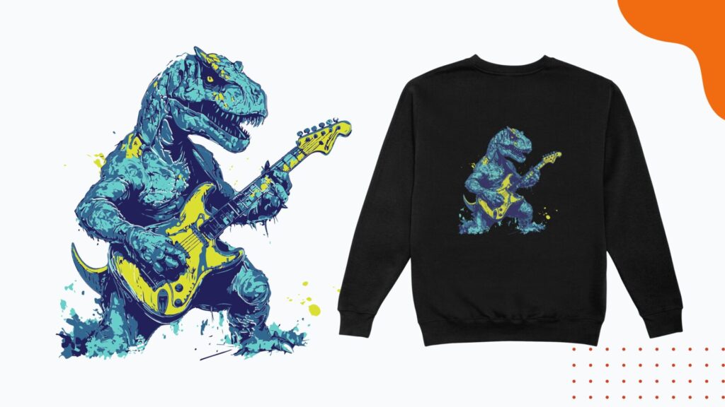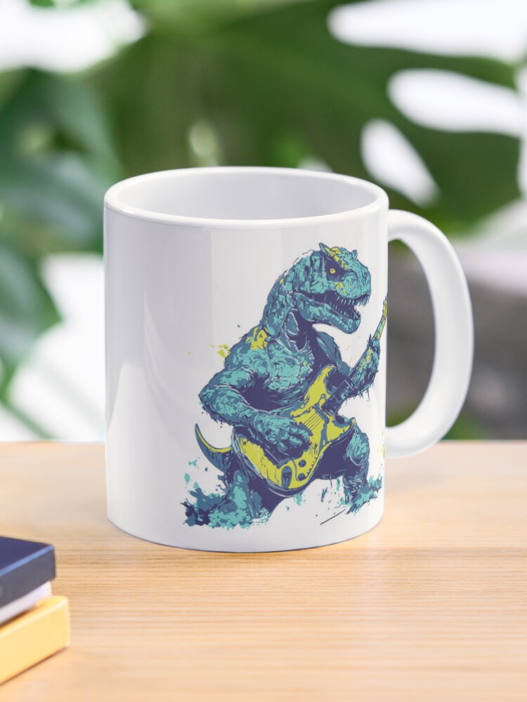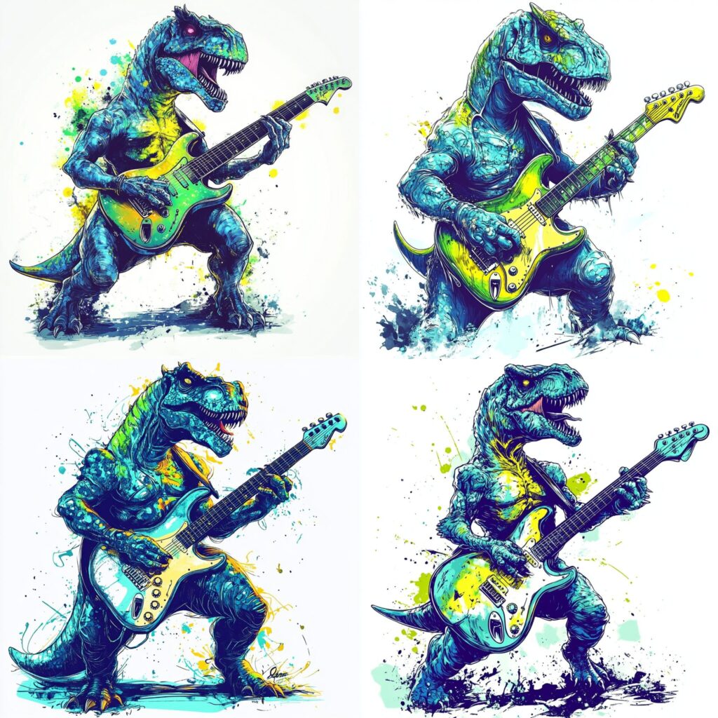 /imagine prompt A mutant monster dinosaur playing an electric guitar in an ink style, isolated on bright white background. The dinosaur should be highly detailed, neon blue+green+yellow colors, japanese textured skin, with exaggerated features and a dynamic pose. The background should be white to highlight the dinosaur and the guitar, with some ink splatters for added effect. –no cropped