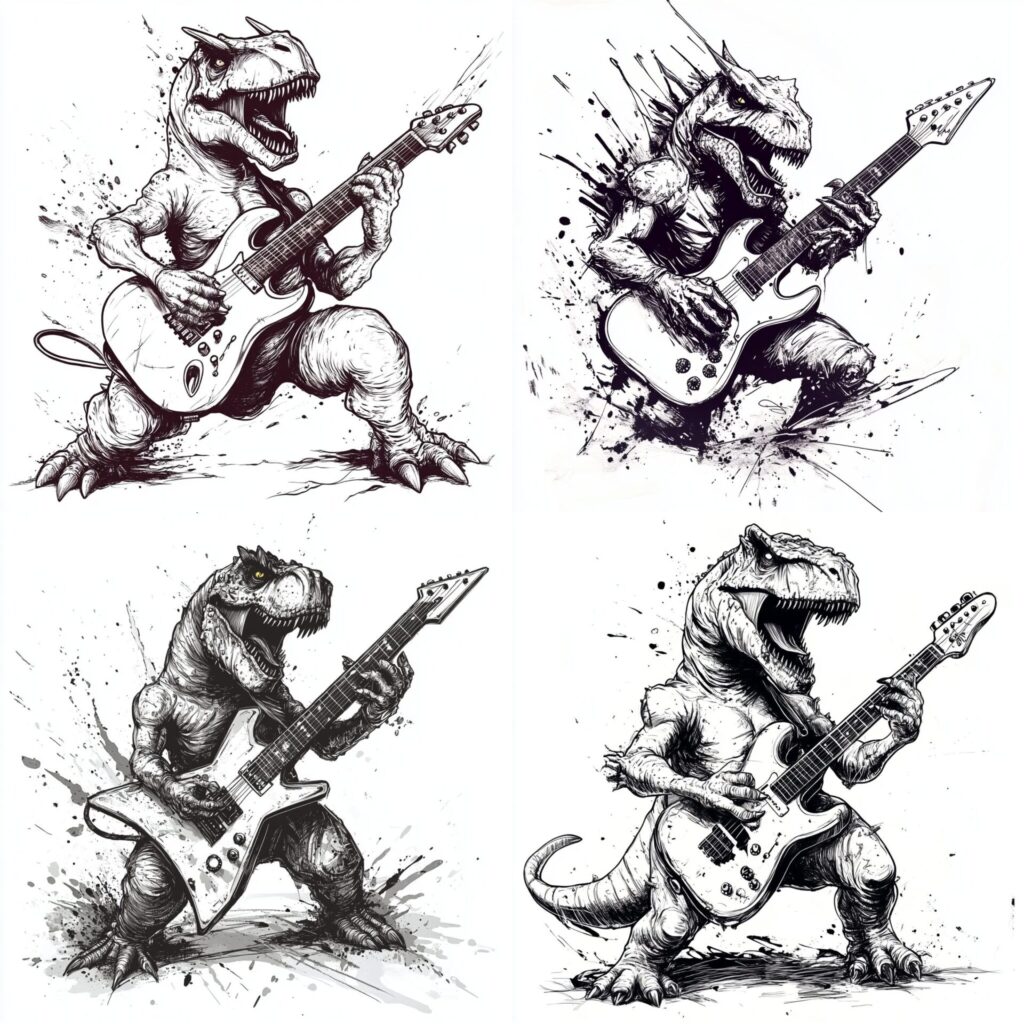 /imagine prompt A mutant monster dinosaur playing an electric guitar in an ink style, isolated on bright white background. The dinosaur should be highly detailed, with exaggerated features and a dynamic pose. The background should be white to highlight the dinosaur and the guitar, with some ink splatters for added effect. –no cropped