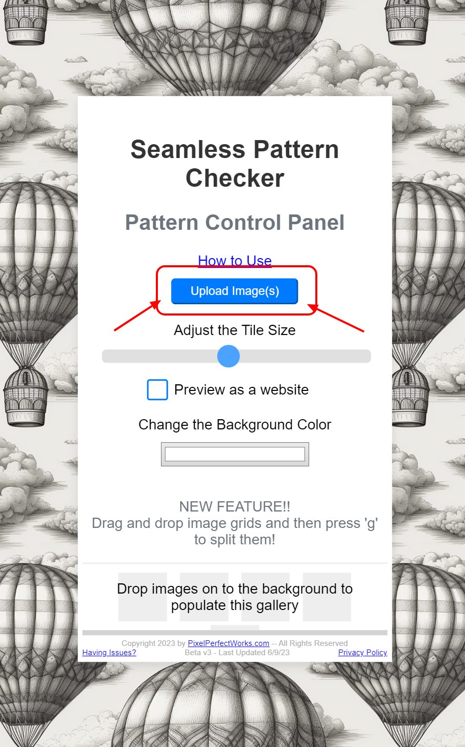 On the homepage, you’ll find an upload section. Click on the “Upload Images” button and select your pattern file from your computer. Alternatively, you can drag and drop your file into the designated area.