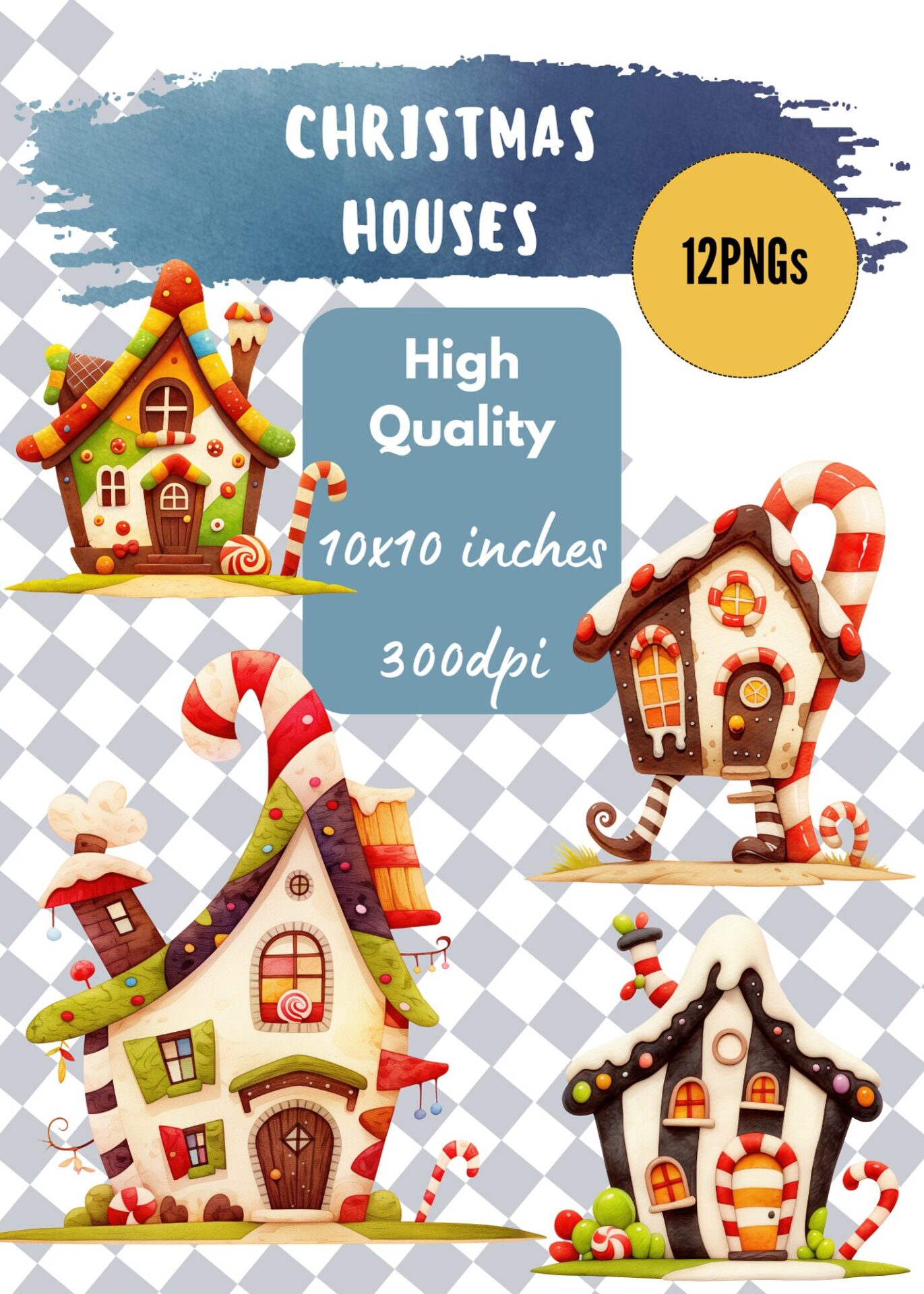 Watercolor Festive Christmas Houses Clipart, 12 PNGs 10×10 Inch