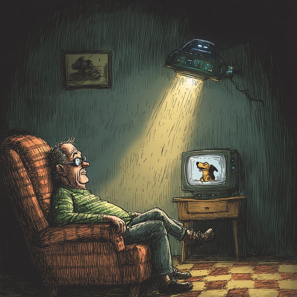 “A middle-aged man in a recliner, watching TV, as an alien ship beams up his dog instead of him, dry humor, hand-drawn cartoon, Gary Larson-inspired.”