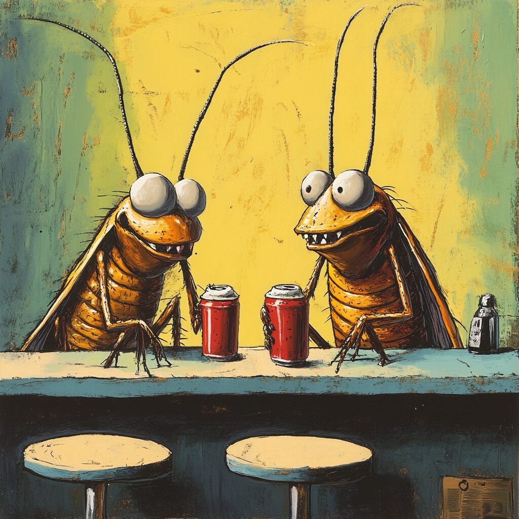 “Two cockroaches sitting at a tiny bar, drinking from soda caps, discussing how humans are terrible tenants, The Far Side cartoon, exaggerated faces.”