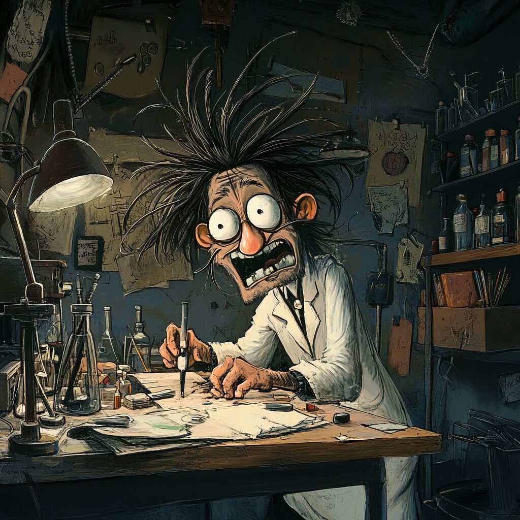 “A wild-haired scientist in a messy lab, accidentally creating a monster, exaggerated cartoon expressions, muted colors, The Far Side style.”